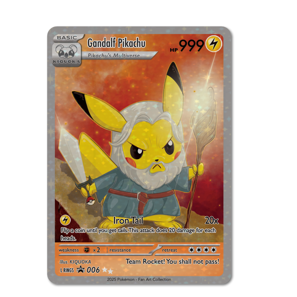 Behold the magical fusion of fantasy and Pokémon with our Gandalf Pikachu custom trading card! This whimsical collectible features everyone's favorite electric mouse wielding a wizard staff and sporting a gray beard. "You shall not pass" takes on a whole new meaning when followed by a thunderbolt attack! Perfect for collectors who appreciate both Middle-earth and Kanto region adventures