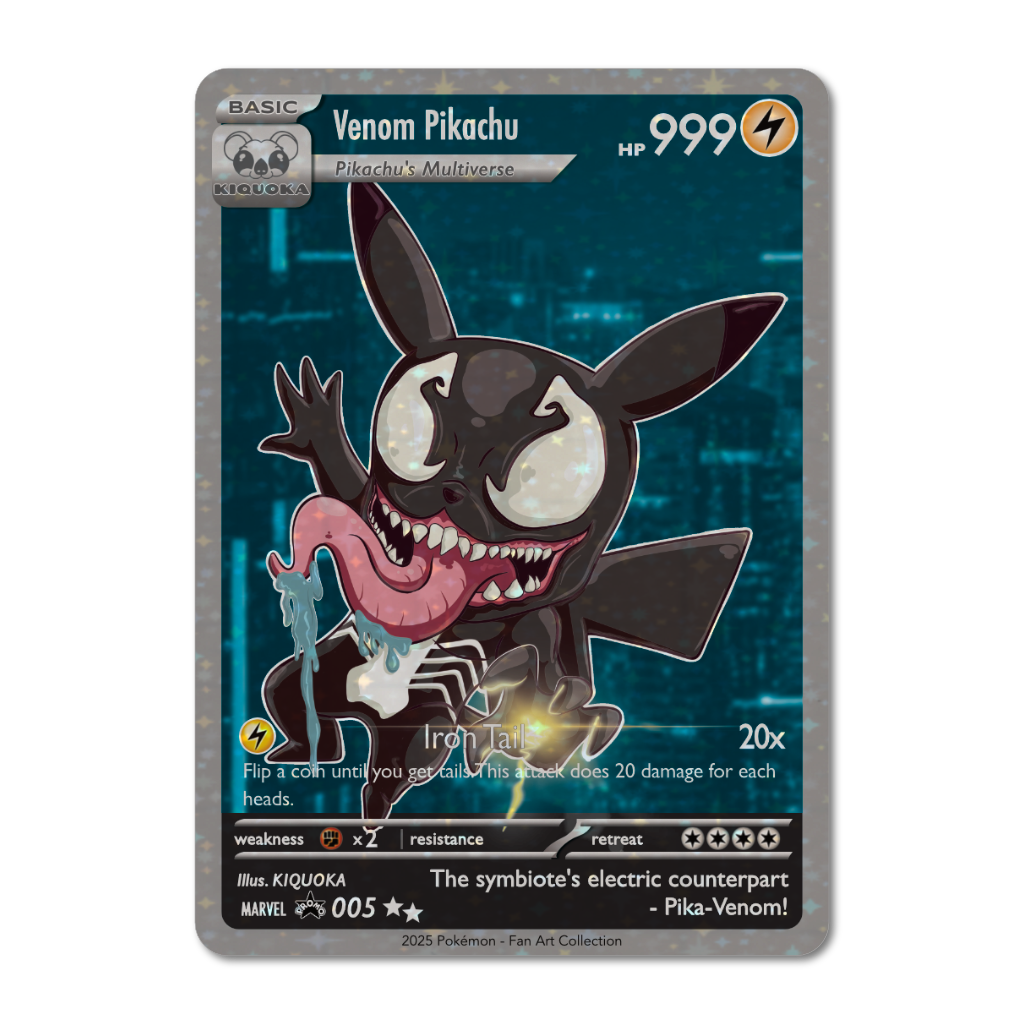 What happens when Pikachu meets the alien symbiote? Pure collecting magic! Our Venom Pikachu custom trading card transforms the cuddly electric mouse into a tongue-lashing, mischievous powerhouse. With its glossy finish and eye-popping artwork, this quirky mashup card brings two universes together in the most electrifyingly wicked way. Zap up your collection with this conversation-starting crossover that's sure to shock fellow traders